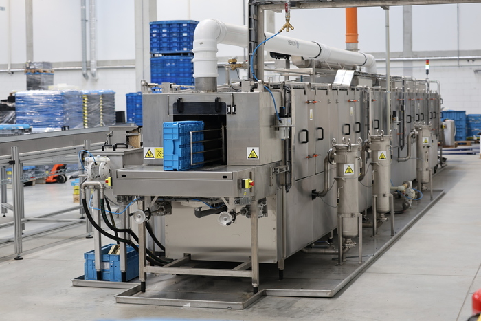 Continuous single-track washing machine designed for KLT crates and lids of various sizes.