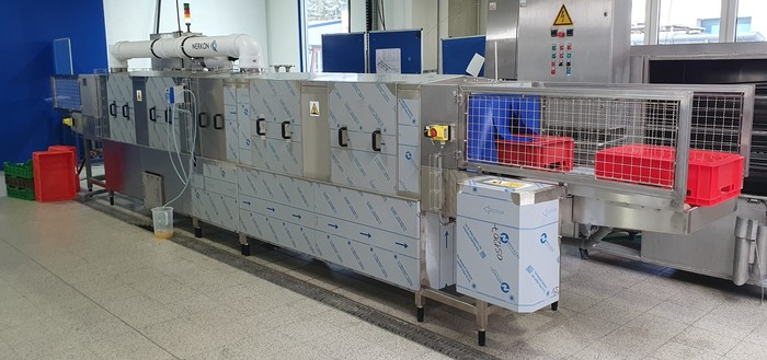 Continuous washing machine for crates E1, E2, and M10 , featuring a rinse with clean water and a cold air blow-off