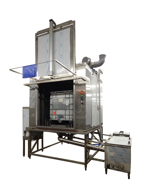 Chamber washing system for IBC containers. Interior cleaning of the container can be combined with exterior cleaning.