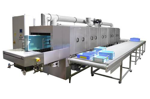 Continuous single-track washing equipment for KLT containers of various sizes and KLT lids of various sizes.