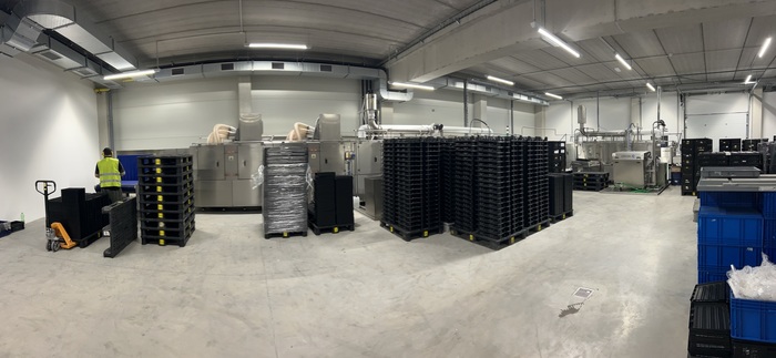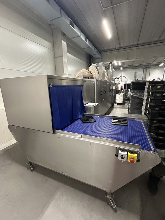 Průběžné jednostopé mycí zařízení KLT přepravek různých rozměrů,