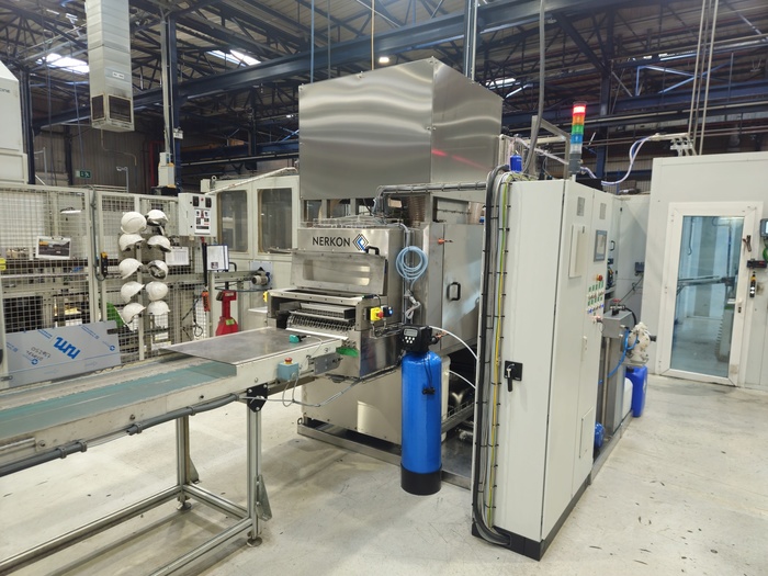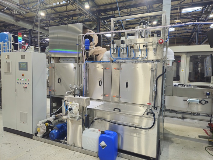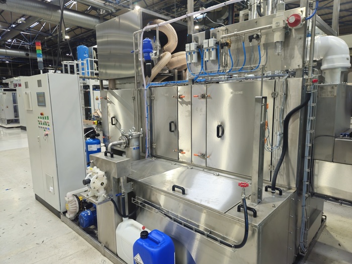 Automatický odlučovač oleje v odmašťovací sekci – externí jednotka (objem cca 100 l, koalescenční přepážky, demulgovaný olej odtéká do sudu, kapalina se vrací samospádem do nádrže)